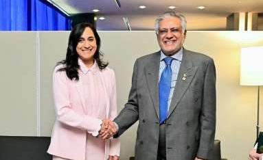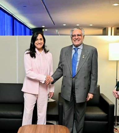 نیویارک :پاکستان کے نائب وزیراعظم و وزیر خارجہ سینیٹر محمد اسحاق ڈار نے کینیڈا کی وزیر خارجہ انیتا آنند سے نیویارک میں اقوام متحدہ کی جنرل اسمبلی کے 80ویں اجلاس کے موقع پر ملاقات کی۔